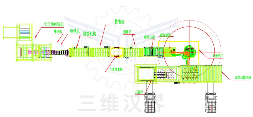 硫銨從烘干床下料口落入輸送帶輸送到包裝機(jī)料倉(cāng),自動(dòng)下料、稱重、取袋套袋、裝料、縫包后,整形并輸送給碼垛機(jī)器人,機(jī)器人碼垛、托盤(pán)庫(kù)自動(dòng)供給空托盤(pán)、滿垛輸送機(jī)輸送、托盤(pán)全自動(dòng)裝車機(jī)裝車或轉(zhuǎn)運(yùn)到倉(cāng)庫(kù)既定位置整齊擺放。